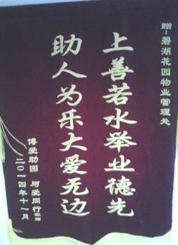碧湖管理處11月積極響應參與“博愛助困,與愛同行”活動,得到深圳市博愛助困與愛同心愛心公益事業(yè)部的錦旗獎勵?;顒映跏?,管理處向小區(qū)業(yè)主大力宣傳,動員業(yè)主把家里多余的舊書籍,舊衣服,舊鞋子,床上用品清理出來,捐贈給最貧困的山區(qū)【云南,貴州,甘肅】需要的人;活動的一周時間里,管理處在小區(qū)各棟一樓大堂設置的愛心捐獻收集點,方便業(yè)主登記和把捐贈的物品放在愛心桶里,平均每天都有四大框捐獻的物品送到舉辦單位。管理處做的不僅僅是捐獻活動,而是在向小區(qū)廣大業(yè)主倡導“博愛助困,助人為樂”精神文明風貌。