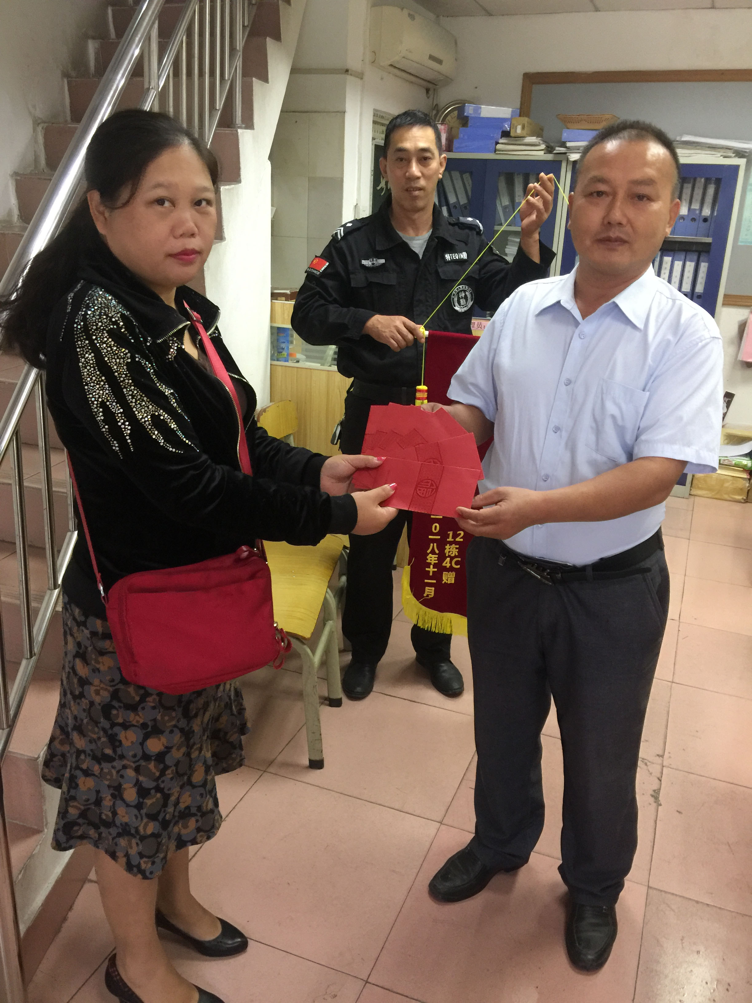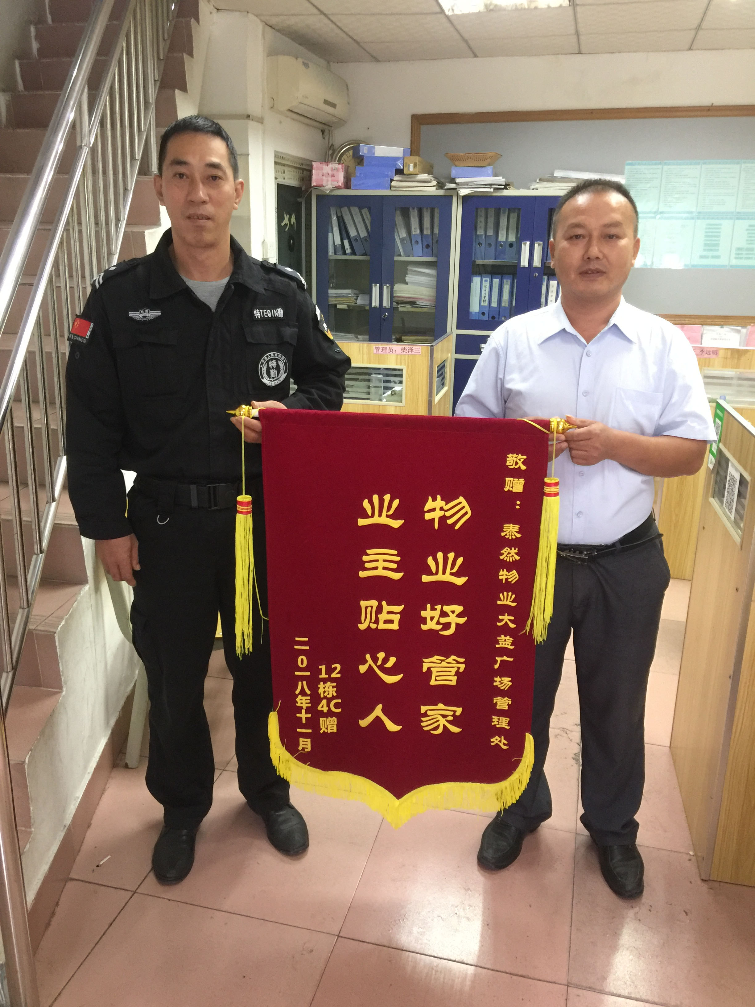 當(dāng)12棟4C業(yè)主收到10000元的協(xié)商賠款時(shí),感激萬分。特制作錦旗兩面,分別贈(zèng)送給大益管理處和業(yè)主委員會(huì)。業(yè)主委員會(huì)也為參加抓小偷的柴澤三、王開金、杜賢立、林睦清、汪斌、徐林南分別頒發(fā)了獎(jiǎng)金,給予鼓勵(lì)。