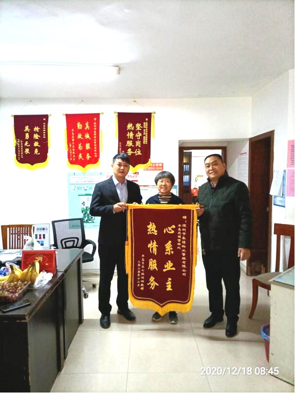 2020年12月18日上午,半島B區(qū)7棟504業(yè)主劉女士將一面“心系業(yè)主,熱情服務(wù)”的錦旗,親自贈送給物業(yè)管理處。