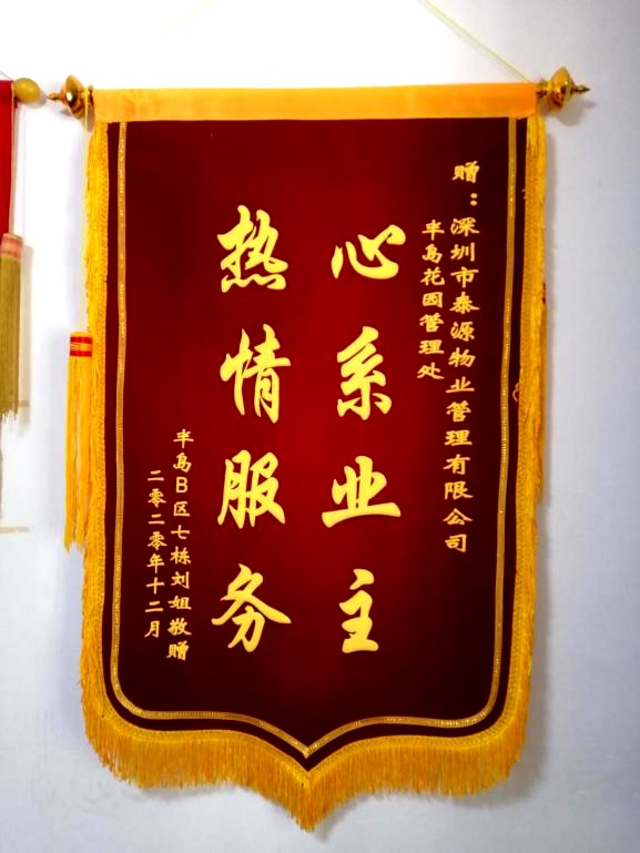 火紅的錦旗是泰源物業(yè)的榮譽(yù),是業(yè)主對管理處服務(wù)的認(rèn)可,更是一種服務(wù)責(zé)任和鼓勵(lì)的動(dòng)力。我們將帶著業(yè)主這份沉甸甸的厚意,繼續(xù)以一流的標(biāo)準(zhǔn)規(guī)范工作,以優(yōu)質(zhì)的服務(wù)回饋業(yè)主。