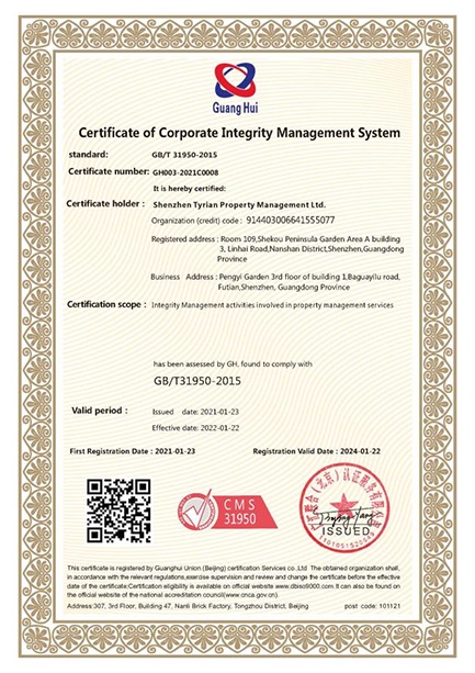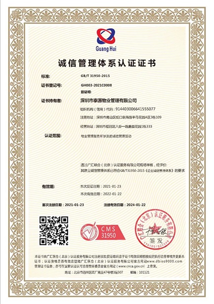 為了適應(yīng)物業(yè)服務(wù)市場(chǎng)的需求,練好發(fā)展內(nèi)功,展現(xiàn)公司盡可能滿足客戶及其他利益相關(guān)方的能力的期望,以確保服務(wù)過程及其結(jié)果的誠信。公司的誠信管理體系通過一系列規(guī)范的運(yùn)作和檢驗(yàn),經(jīng)認(rèn)證公司對(duì)誠信體系和運(yùn)作過程的嚴(yán)格審核,于2021年1月通過了GB/T31950-2015誠信管理體系的認(rèn)證審核,并取得證書。