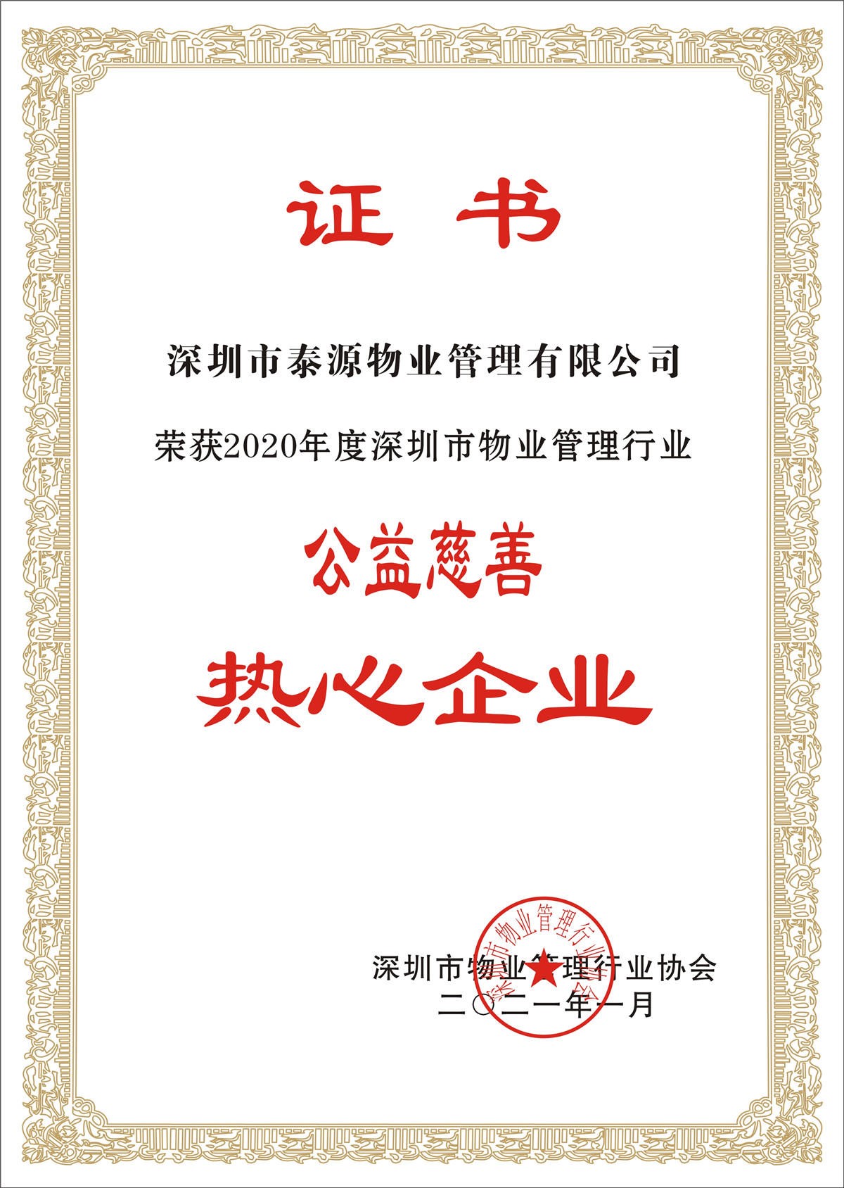 泰源物業(yè)響應(yīng)和落實(shí)深圳市物業(yè)管理行業(yè)黨委和行業(yè)協(xié)會(huì)“千物企雙百萬(wàn)”的任務(wù),履行社會(huì)責(zé)任,積極開(kāi)展扶貧、濟(jì)貧捐助、公益慈善的活動(dòng)。因表現(xiàn)突出,被市物協(xié)評(píng)為行業(yè)2020年度“公益慈善熱心企業(yè)”稱(chēng)號(hào)。