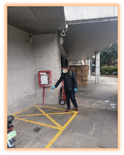 圖為 半島花園管理處對外賣、快遞統(tǒng)一消毒并搭建收納架