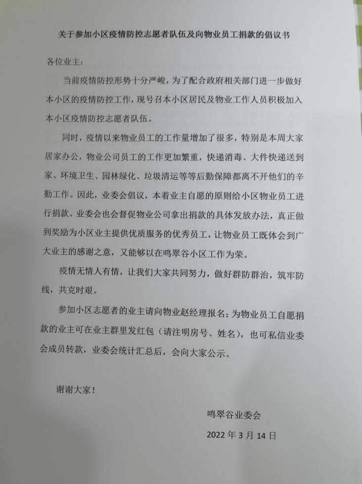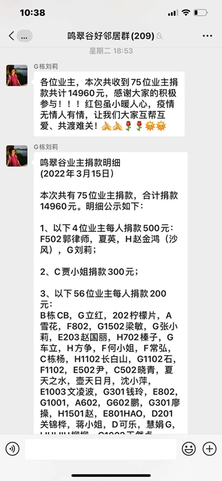 鳴翠谷業(yè)委會(huì)倡議捐款獎(jiǎng)物業(yè)員工,業(yè)主積極響應(yīng)