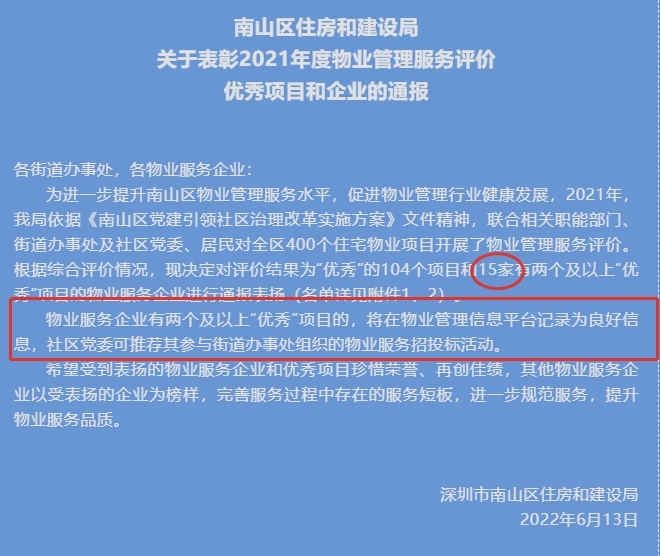 2021年,南山區(qū)住房和建設(shè)局根據(jù)《南山區(qū)黨建引領(lǐng)社區(qū)治理改革方案》文件精神,聯(lián)合相關(guān)職能部門以及街道辦、社區(qū)黨委和居民對全區(qū)住宅物業(yè)項(xiàng)目開展了物業(yè)管理服務(wù)評價活動。南山區(qū)住房和建設(shè)局開展此項(xiàng)物業(yè)管理服務(wù)評價活動,旨在進(jìn)一步提升南山區(qū)物業(yè)管理服務(wù)水平,促進(jìn)物業(yè)管理行業(yè)健康發(fā)展。