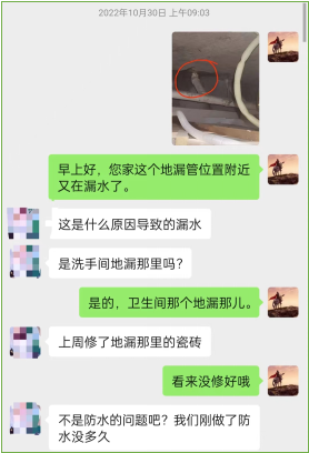 2022年8月李女士發(fā)現(xiàn)衛(wèi)生間頂棚漏水,管家李紅軍及時(shí)與樓上的業(yè)主協(xié)調(diào),業(yè)主短時(shí)間內(nèi)完成了漏水修補(bǔ)。然而兩個(gè)月后,李女士發(fā)現(xiàn)衛(wèi)生間頂棚又滴水了,經(jīng)查看,確認(rèn)是樓上地漏堵了,導(dǎo)致地漏管口邊滲水,管家李紅軍又與樓上的業(yè)主協(xié)調(diào),疏通了堵塞的地漏管,同時(shí)請業(yè)主對管口邊做防水,從而解決多次滲水問題。